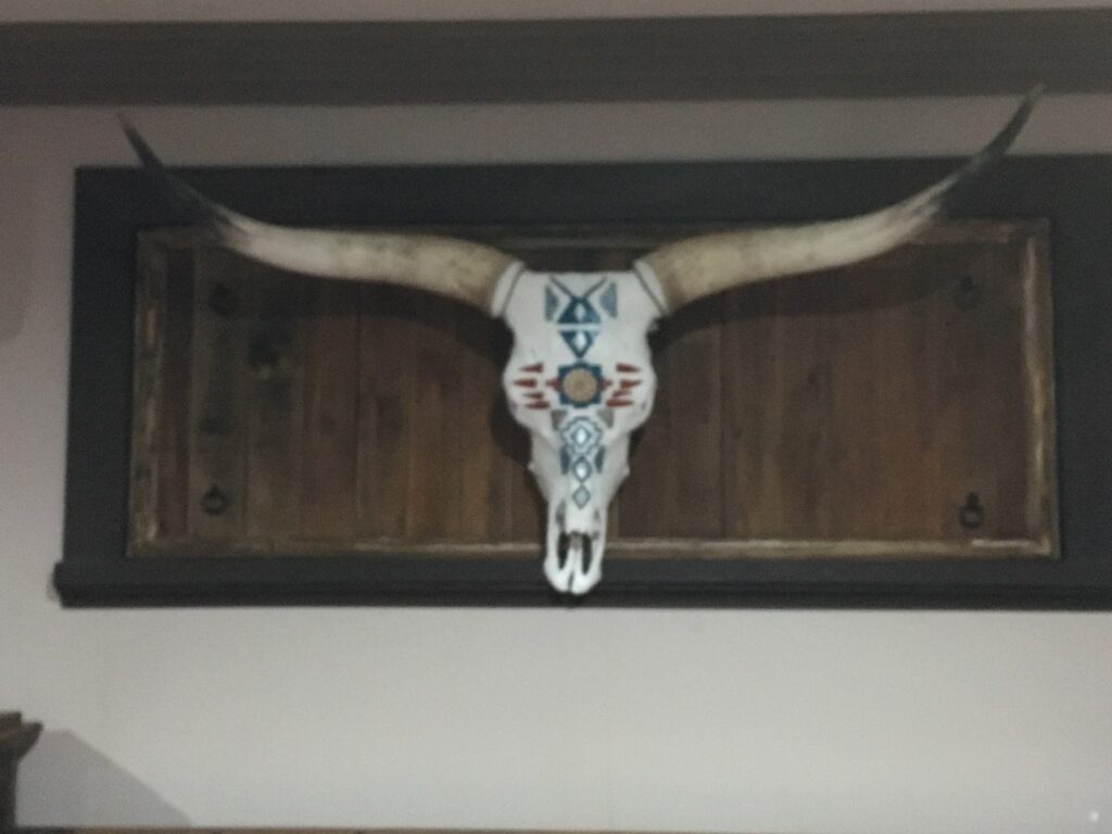 The horns were done natural as requested by the owner & The AZTEC theme on the skull was painted by Jacquie Wilkinson @ the owner’s request
